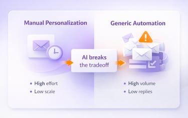 AI works by analyzing real data about your prospects (like firmographics, behavior, and intent) to tailor messages that feel custom to each recipient, even when you’re sending thousands. This blend of data, AI logic, and human strategy allows teams to break the age-old tradeoff between personal and scalable.