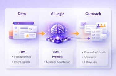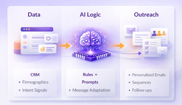 AI systems pull information from multiple sources, CRM data, engagement history, intent signals, and firmographics, to build context for each recipient before writing a message. This moves beyond superficial personalization (like just adding a name).