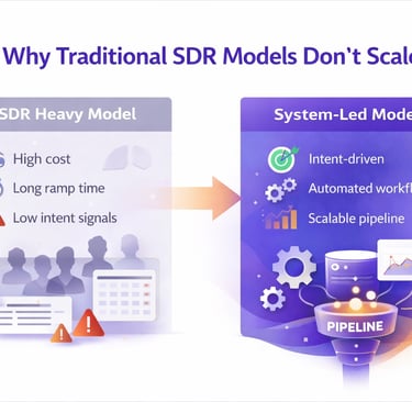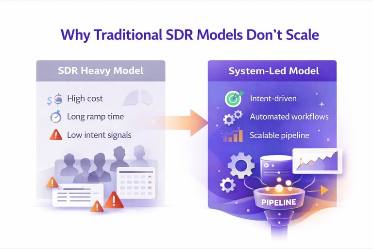 Traditional SDR playbooks, hiring reps to churn cold outreach, come with high costs, long ramp time, and unpredictable outcomes. At fully loaded costs of $90K–$140K per SDR per year, it’s easy for teams to burn cash without building predictable pipeline.